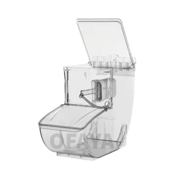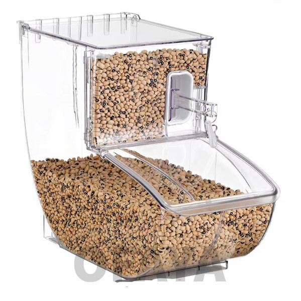 Прозрачен диспенсър за насипни храни, изработен от поликарбонат, идеален за хигиенично съхранение и дозиране на продукти.