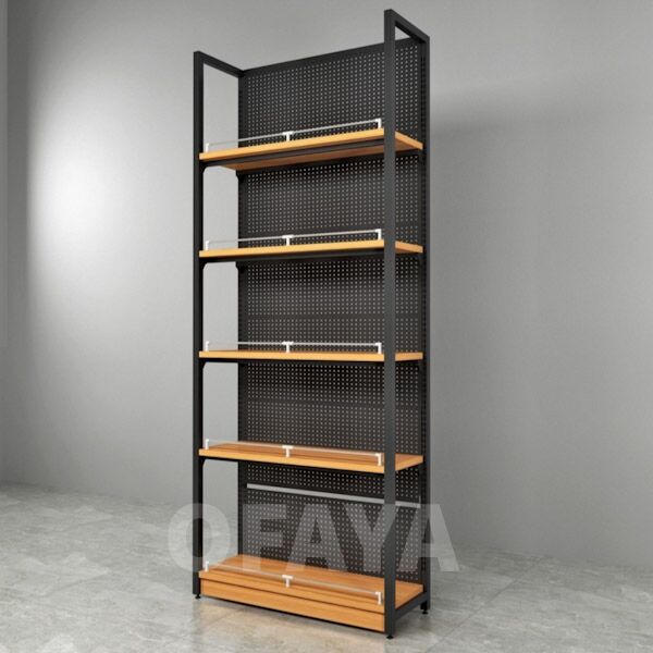 Метален стелаж за търговия на дребно, подходящ за супермаркети или магазини. Материал: Стомана с дървени рафтове.